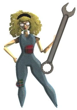 She is much more humanoid than most other characters in LittleBigPlanet, appearing as a slim young woman with puffy, blonde hair who wears blue denim dungarees and has no feet. In The Journey Home, she wears different dungarees with no patches, and a different pair of sunglasses.